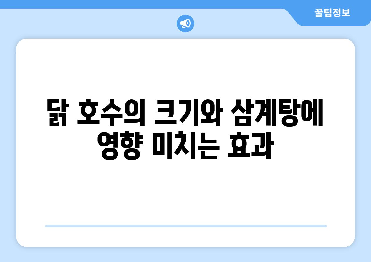닭 호수의 크기는 삼계탕의 맛과 영양분에 영향을 미칩니다. 다음 표는 닭 호수의 크기에 따른 삼계탕의 특성을 비교한 것입니다.